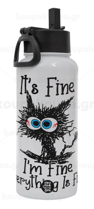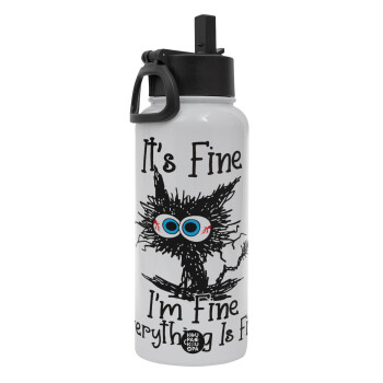 Cat, It's Fine I'm Fine Everything Is Fine, Μεταλλικό παγούρι θερμός Λευκό με καλαμάκι και χερούλι (Stainless steel), διπλού τοιχώματος, 950ml
