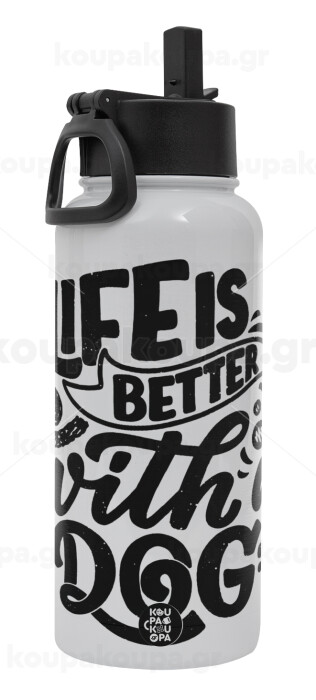 Life is better with a DOG, Μεταλλικό παγούρι θερμός Λευκό με καλαμάκι και χερούλι (Stainless steel), διπλού τοιχώματος, 950ml