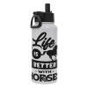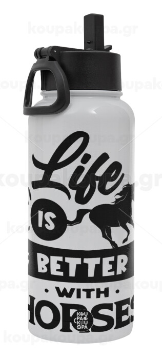 Life is Better with a Horses, Μεταλλικό παγούρι θερμός Λευκό με καλαμάκι και χερούλι (Stainless steel), διπλού τοιχώματος, 950ml