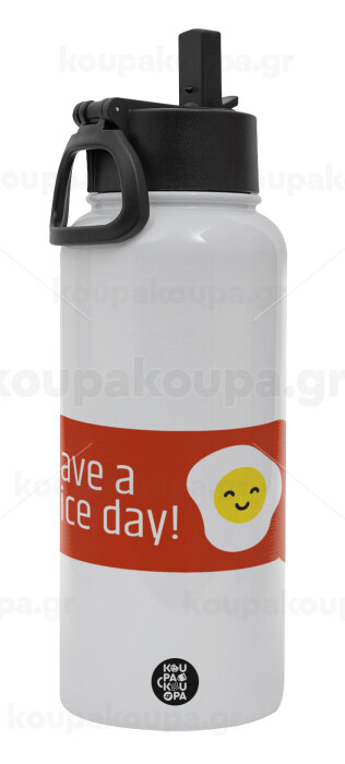 Have a nice day Emoji, Μεταλλικό παγούρι θερμός Λευκό με καλαμάκι και χερούλι (Stainless steel), διπλού τοιχώματος, 950ml