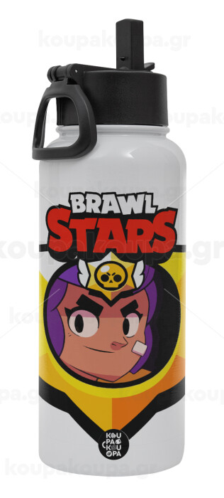 Brawl Stars Shelly, Μεταλλικό παγούρι θερμός Λευκό με καλαμάκι και χερούλι (Stainless steel), διπλού τοιχώματος, 950ml