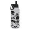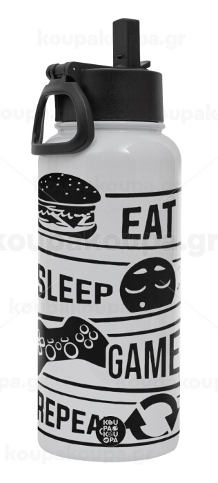 Eat Sleep Game Repeat, Μεταλλικό παγούρι θερμός Λευκό με καλαμάκι και χερούλι (Stainless steel), διπλού τοιχώματος, 950ml