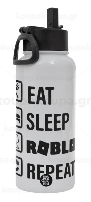 Eat, Sleep, Roblox, Repeat, Μεταλλικό παγούρι θερμός Λευκό με καλαμάκι και χερούλι (Stainless steel), διπλού τοιχώματος, 950ml