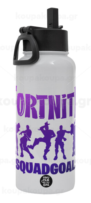 Fortnite #squadgoals, Μεταλλικό παγούρι θερμός Λευκό με καλαμάκι και χερούλι (Stainless steel), διπλού τοιχώματος, 950ml