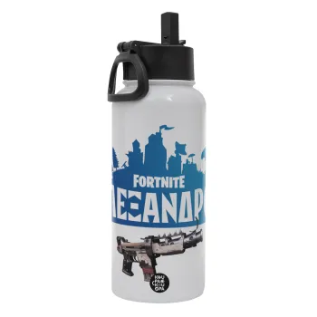 Fortnite with gun με το όνομα σου, Μεταλλικό παγούρι θερμός Λευκό με καλαμάκι και χερούλι (Stainless steel), διπλού τοιχώματος, 950ml