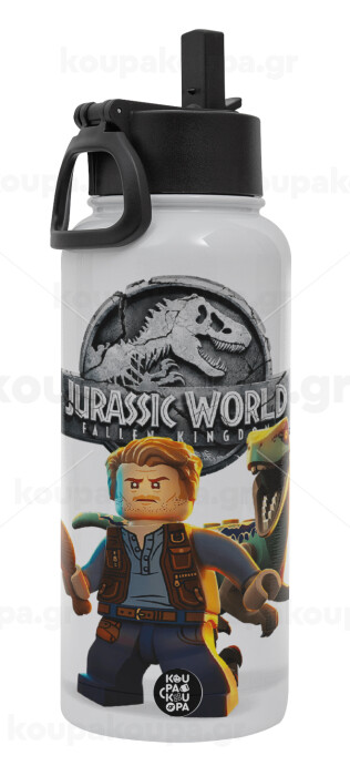 Jurassic world, Μεταλλικό παγούρι θερμός Λευκό με καλαμάκι και χερούλι (Stainless steel), διπλού τοιχώματος, 950ml