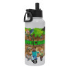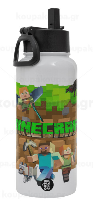 Minecraft characters, Μεταλλικό παγούρι θερμός Λευκό με καλαμάκι και χερούλι (Stainless steel), διπλού τοιχώματος, 950ml