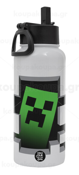 Minecraft creeper, Μεταλλικό παγούρι θερμός Λευκό με καλαμάκι και χερούλι (Stainless steel), διπλού τοιχώματος, 950ml