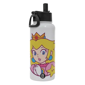 Princess Peach, Μεταλλικό παγούρι θερμός Λευκό με καλαμάκι και χερούλι (Stainless steel), διπλού τοιχώματος, 950ml