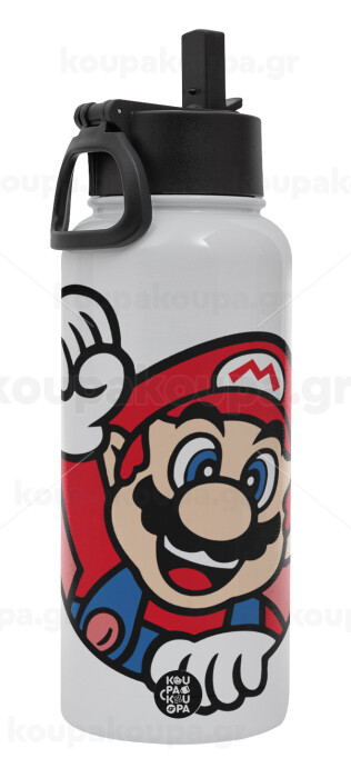 Super mario win, Μεταλλικό παγούρι θερμός Λευκό με καλαμάκι και χερούλι (Stainless steel), διπλού τοιχώματος, 950ml