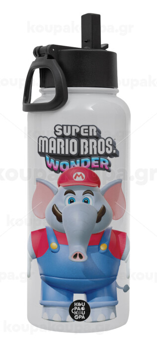Super mario wonder, Μεταλλικό παγούρι θερμός Λευκό με καλαμάκι και χερούλι (Stainless steel), διπλού τοιχώματος, 950ml
