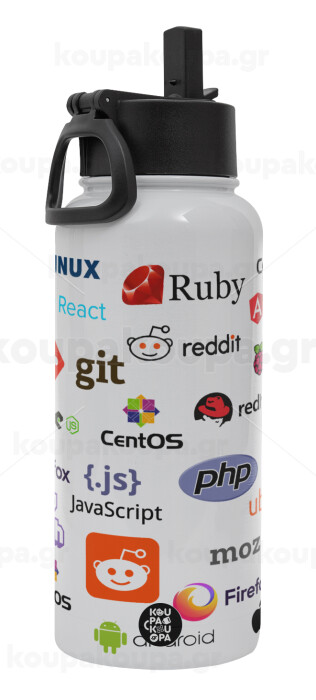 Tech logos, Μεταλλικό παγούρι θερμός Λευκό με καλαμάκι και χερούλι (Stainless steel), διπλού τοιχώματος, 950ml