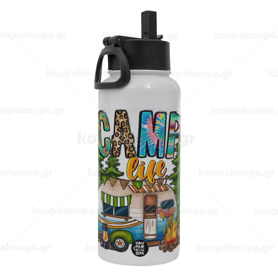 Camp Life, Μεταλλικό παγούρι θερμός Λευκό με καλαμάκι και χερούλι (Stainless steel), διπλού τοιχώματος, 950ml