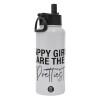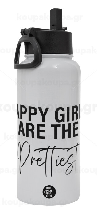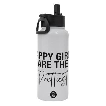 Happy girls are the prettiest, Μεταλλικό παγούρι θερμός Λευκό με καλαμάκι και χερούλι (Stainless steel), διπλού τοιχώματος, 950ml
