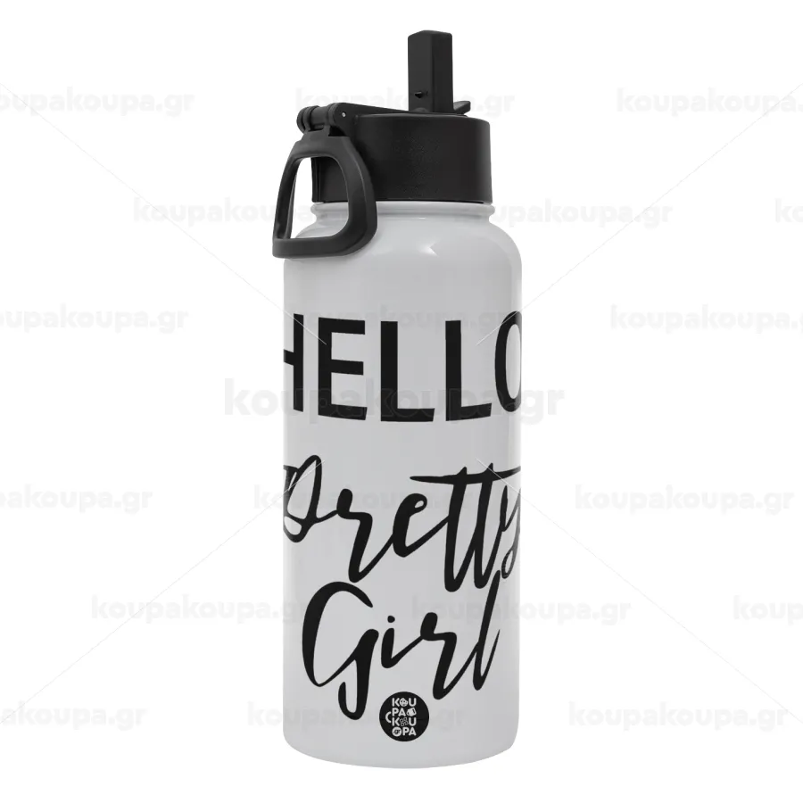 Hello pretty girl, Μεταλλικό παγούρι θερμός Λευκό με καλαμάκι και χερούλι (Stainless steel), διπλού τοιχώματος, 950ml