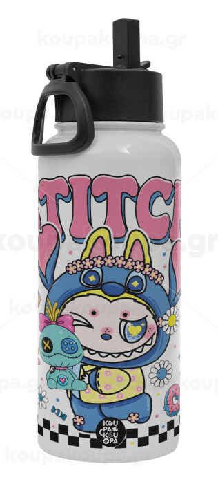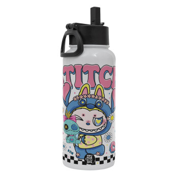 Labubu Stitch, Μεταλλικό παγούρι θερμός Λευκό με καλαμάκι και χερούλι (Stainless steel), διπλού τοιχώματος, 950ml