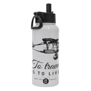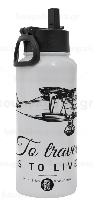 To travel is to live, Μεταλλικό παγούρι θερμός Λευκό με καλαμάκι και χερούλι (Stainless steel), διπλού τοιχώματος, 950ml