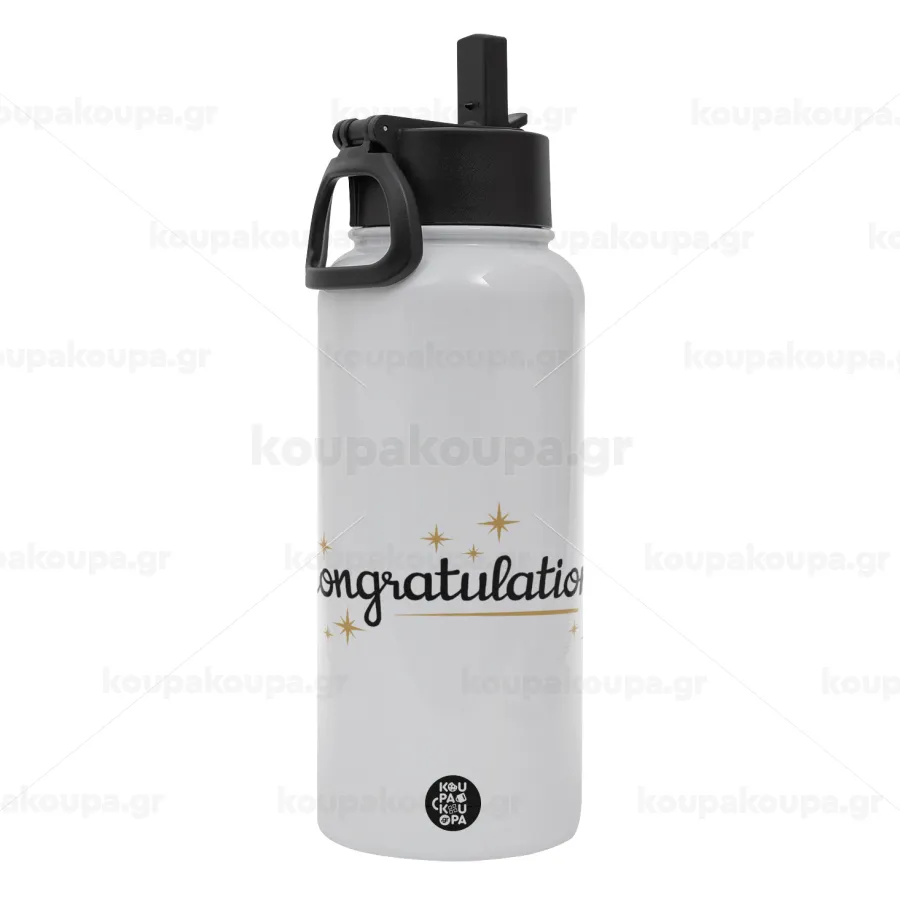 Congratulations, Μεταλλικό παγούρι θερμός Λευκό με καλαμάκι και χερούλι (Stainless steel), διπλού τοιχώματος, 950ml