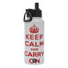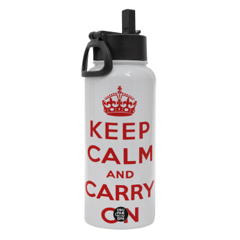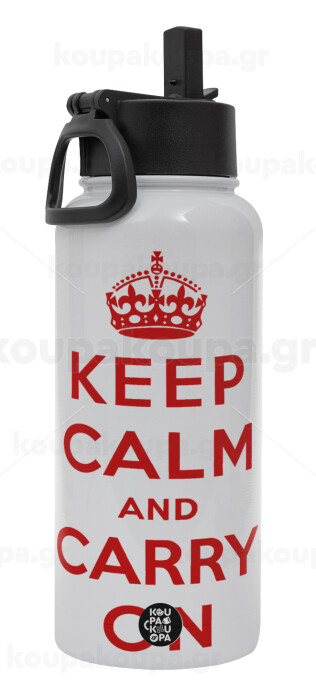 KEEP CALM  and carry on, Μεταλλικό παγούρι θερμός Λευκό με καλαμάκι και χερούλι (Stainless steel), διπλού τοιχώματος, 950ml