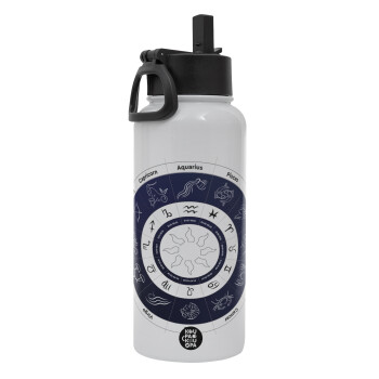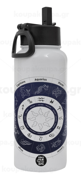 Ζωδιακός κύκλος, Μεταλλικό παγούρι θερμός Λευκό με καλαμάκι και χερούλι (Stainless steel), διπλού τοιχώματος, 950ml