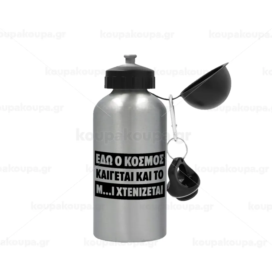 Εδώ ο κόσμος καίγεται και το Μ....Ι χτενίζεται, Μεταλλικό παγούρι νερού, Ασημένιο, αλουμινίου 500ml