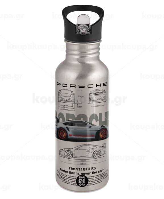 Porsche, Παγούρι νερού Ασημένιο με καλαμάκι, ανοξείδωτο ατσάλι 600ml