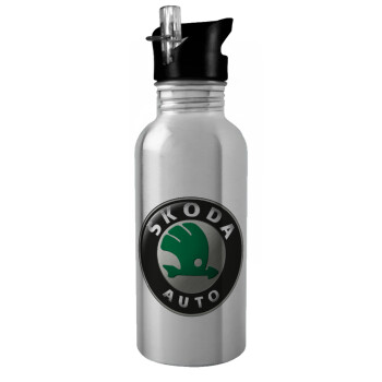 SKODA, Παγούρι νερού Ασημένιο με καλαμάκι, ανοξείδωτο ατσάλι 600ml