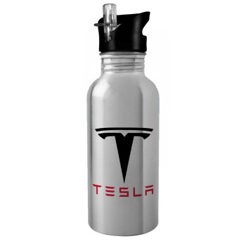 Tesla motors, Παγούρι νερού Ασημένιο με καλαμάκι, ανοξείδωτο ατσάλι 600ml