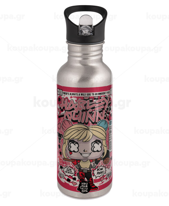 Harley Quinn (Χάρλεϊ Κουίν), Παγούρι νερού Ασημένιο με καλαμάκι, ανοξείδωτο ατσάλι 600ml