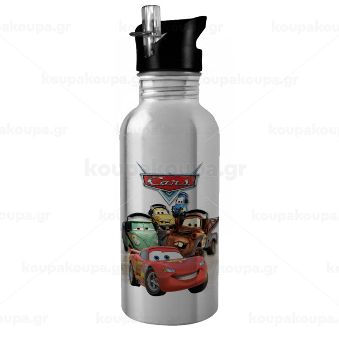 Αυτοκίνητα, Παγούρι νερού Ασημένιο με καλαμάκι, ανοξείδωτο ατσάλι 600ml