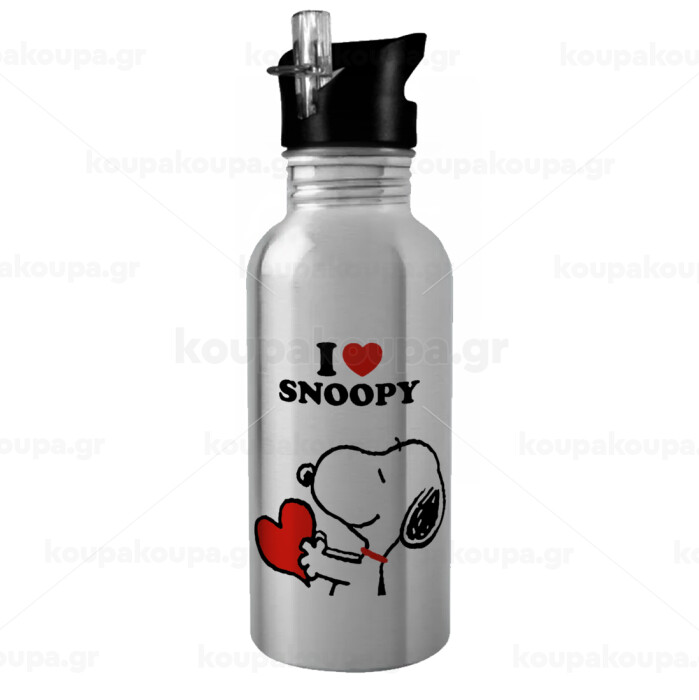 I LOVE SNOOPY, Παγούρι νερού Ασημένιο με καλαμάκι, ανοξείδωτο ατσάλι 600ml