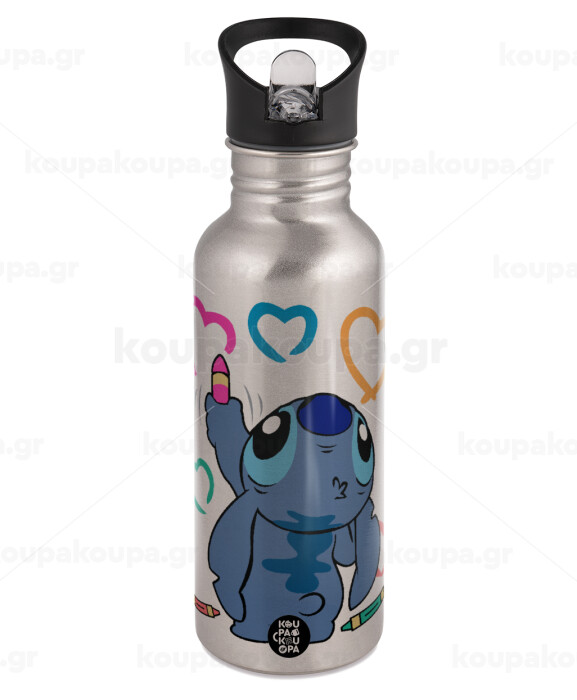 Lilo & Stitch painting, Παγούρι νερού Ασημένιο με καλαμάκι, ανοξείδωτο ατσάλι 600ml