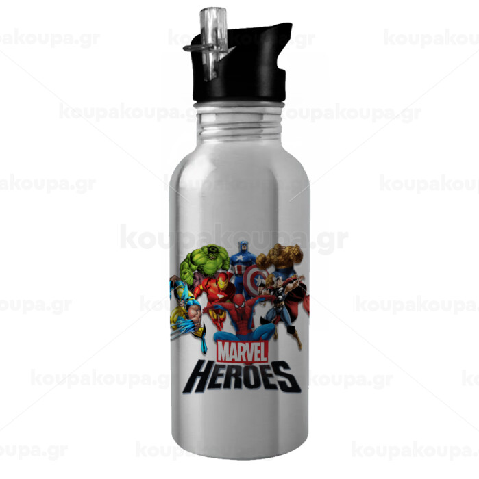 MARVEL heroes, Παγούρι νερού Ασημένιο με καλαμάκι, ανοξείδωτο ατσάλι 600ml