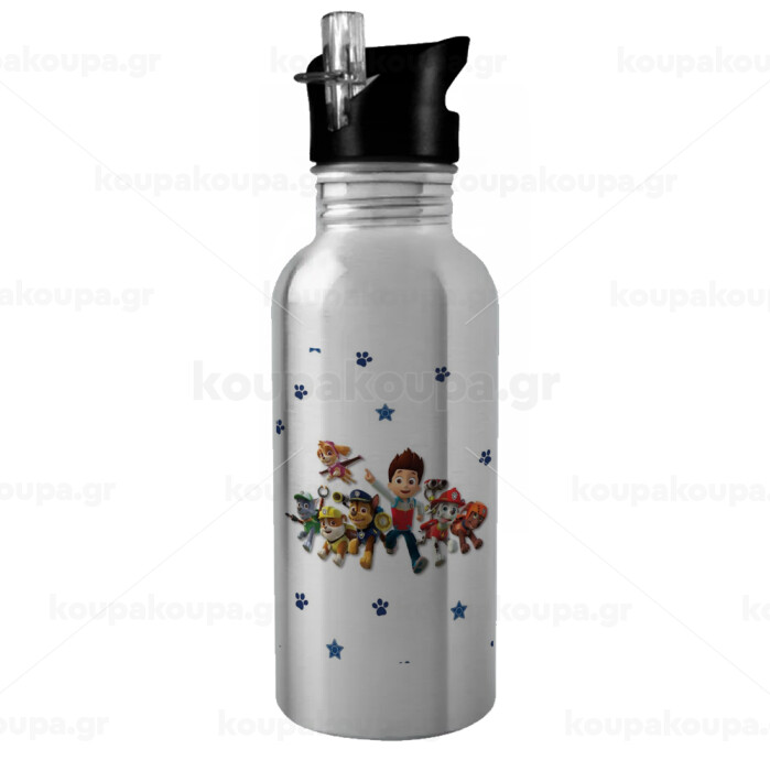 paw patrol, Παγούρι νερού Ασημένιο με καλαμάκι, ανοξείδωτο ατσάλι 600ml