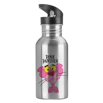 Pink Panther cartoon, Παγούρι νερού Ασημένιο με καλαμάκι, ανοξείδωτο ατσάλι 600ml