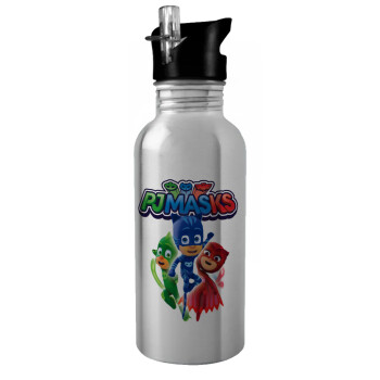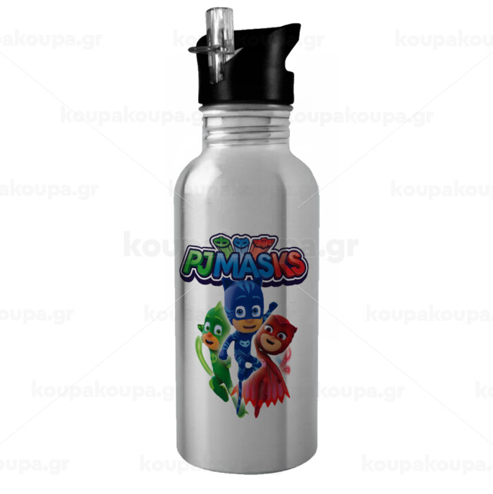 PJ masks, Παγούρι νερού Ασημένιο με καλαμάκι, ανοξείδωτο ατσάλι 600ml