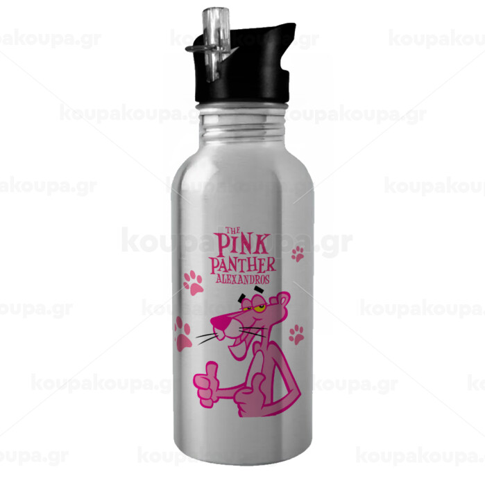 The pink panther, Παγούρι νερού Ασημένιο με καλαμάκι, ανοξείδωτο ατσάλι 600ml