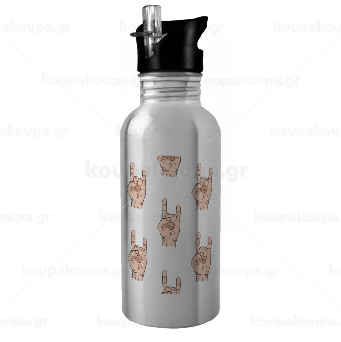 Rock hands, Παγούρι νερού Ασημένιο με καλαμάκι, ανοξείδωτο ατσάλι 600ml