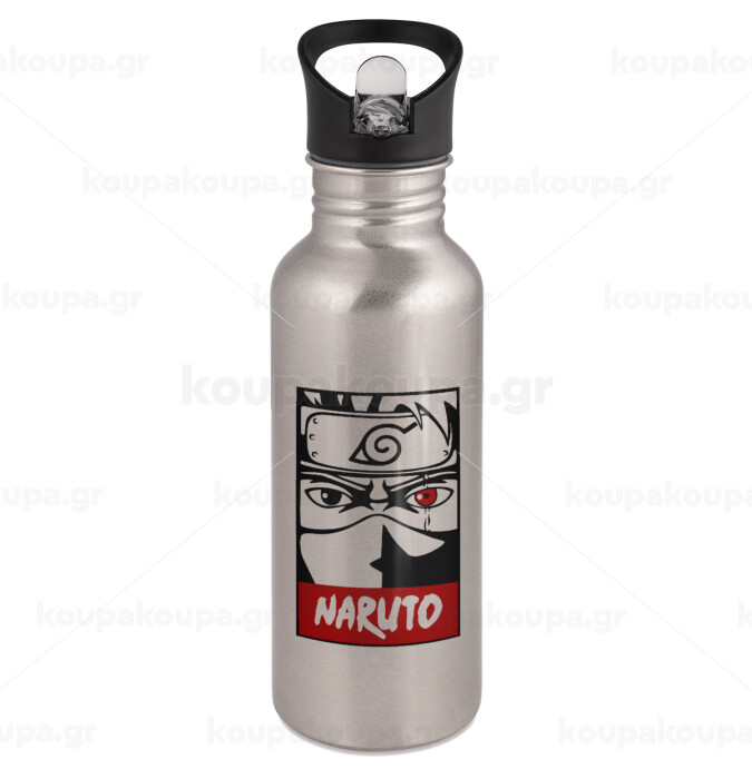 Naruto anime, Παγούρι νερού Ασημένιο με καλαμάκι, ανοξείδωτο ατσάλι 600ml