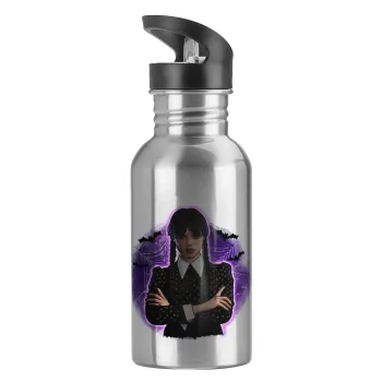 Wednesday moonlight, Παγούρι νερού Ασημένιο με καλαμάκι, ανοξείδωτο ατσάλι 600ml