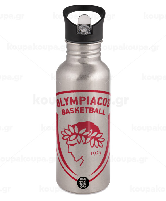 Olympiacos B.C., Παγούρι νερού Ασημένιο με καλαμάκι, ανοξείδωτο ατσάλι 600ml