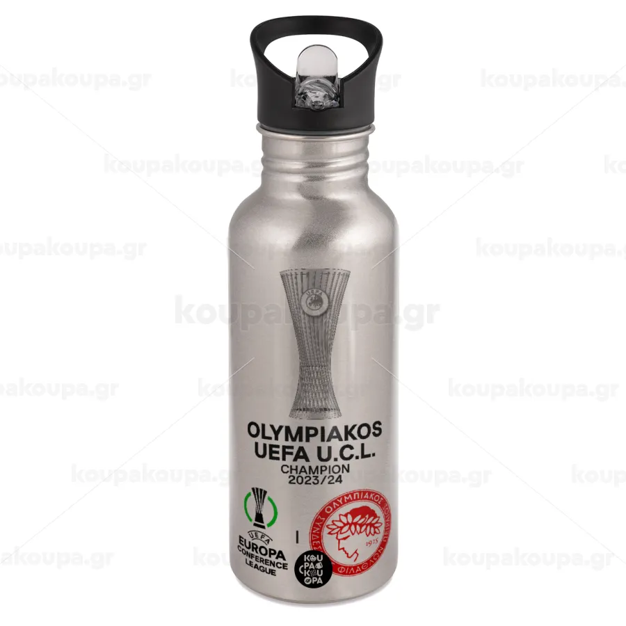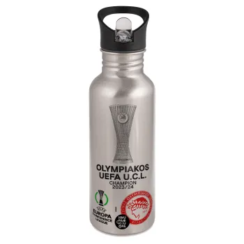 Ολυμπιακός νικητής UEFA Europa Conference League Champion 2023/24, Παγούρι νερού Ασημένιο με καλαμάκι, ανοξείδωτο ατσάλι 600ml