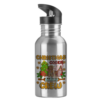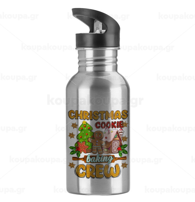 Christmas Cookie Baking Crew, Παγούρι νερού Ασημένιο με καλαμάκι, ανοξείδωτο ατσάλι 600ml
