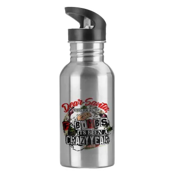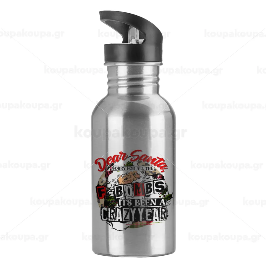 Dear Santa, sorry for all the F-bombs, Παγούρι νερού Ασημένιο με καλαμάκι, ανοξείδωτο ατσάλι 600ml