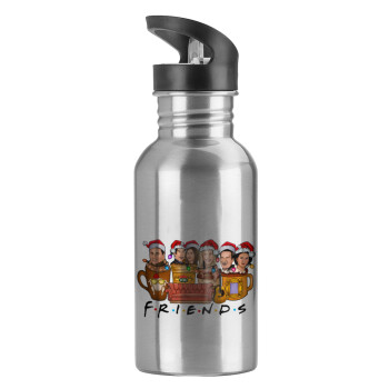 FRIENDS xmas, Παγούρι νερού Ασημένιο με καλαμάκι, ανοξείδωτο ατσάλι 600ml