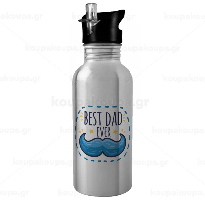 Best dad ever μπλε μουστάκι, Παγούρι νερού Ασημένιο με καλαμάκι, ανοξείδωτο ατσάλι 600ml