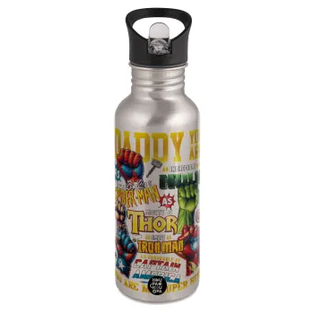 Daddy You Are my Hero, Παγούρι νερού Ασημένιο με καλαμάκι, ανοξείδωτο ατσάλι 600ml
