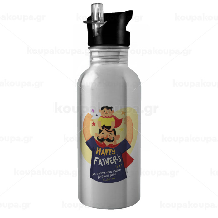 Happy Fathers Day με όνομα, Παγούρι νερού Ασημένιο με καλαμάκι, ανοξείδωτο ατσάλι 600ml