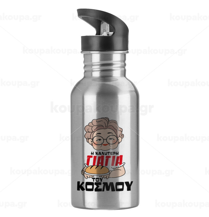 Η καλύτερη γιαγιά του κόσμου!, Παγούρι νερού Ασημένιο με καλαμάκι, ανοξείδωτο ατσάλι 600ml
