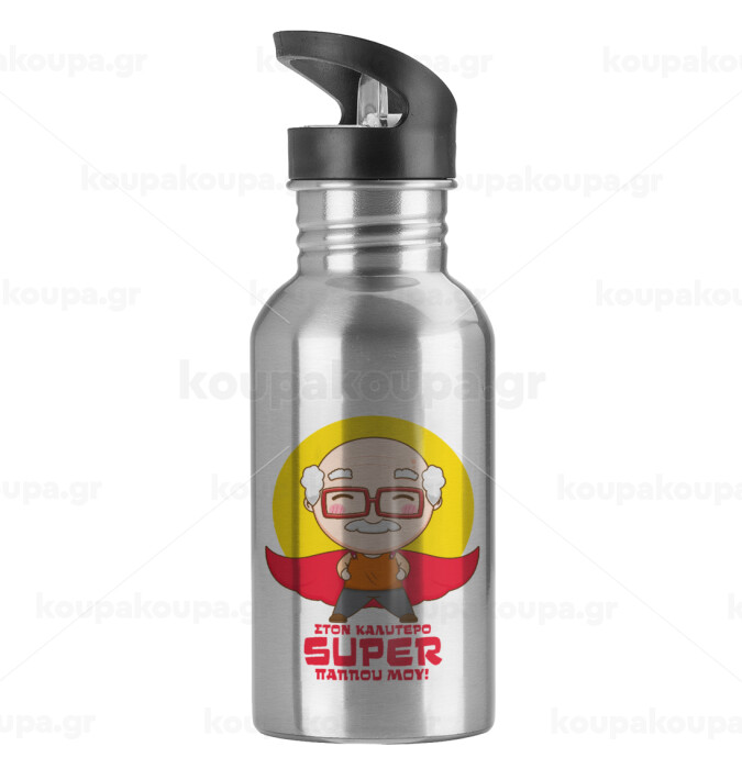 Στον καλύτερο Super παππού μου!, Παγούρι νερού Ασημένιο με καλαμάκι, ανοξείδωτο ατσάλι 600ml